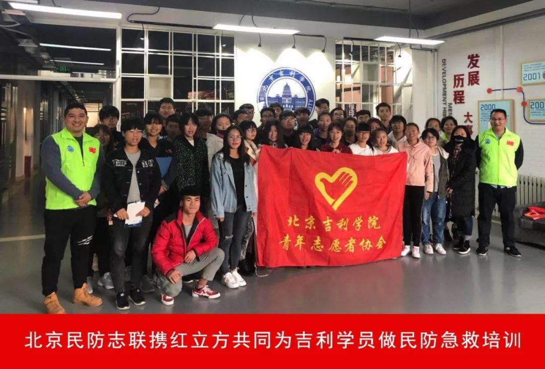 2018年10月27日,北京紅立方醫療設備有限公司受北京民防志愿者聯盟邀請,赴北京市昌平區北京吉利學院,義務為北京吉利學院青年志愿者協會學員們做民防急救逃生培訓課程。培訓中學員們在