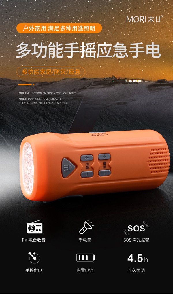 手電筒的高亮度LED燈珠,能瞬間照亮大片區(qū)域,多種照明模式可靈活切換。內(nèi)置的FM收音機(jī),讓您及時(shí)獲取外界信息。手搖發(fā)電功能,讓您只需搖動(dòng)手柄幾分鐘,就能獲得數(shù)小時(shí)照明。USB充電接口,還能為手機(jī)等設(shè)備充電,確保通訊暢通。