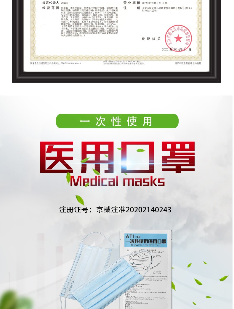 【適用范圍】一次性使用醫用口罩適用于佩戴者不存在體液和噴濺風險的普通醫療環境下的衛生護理。