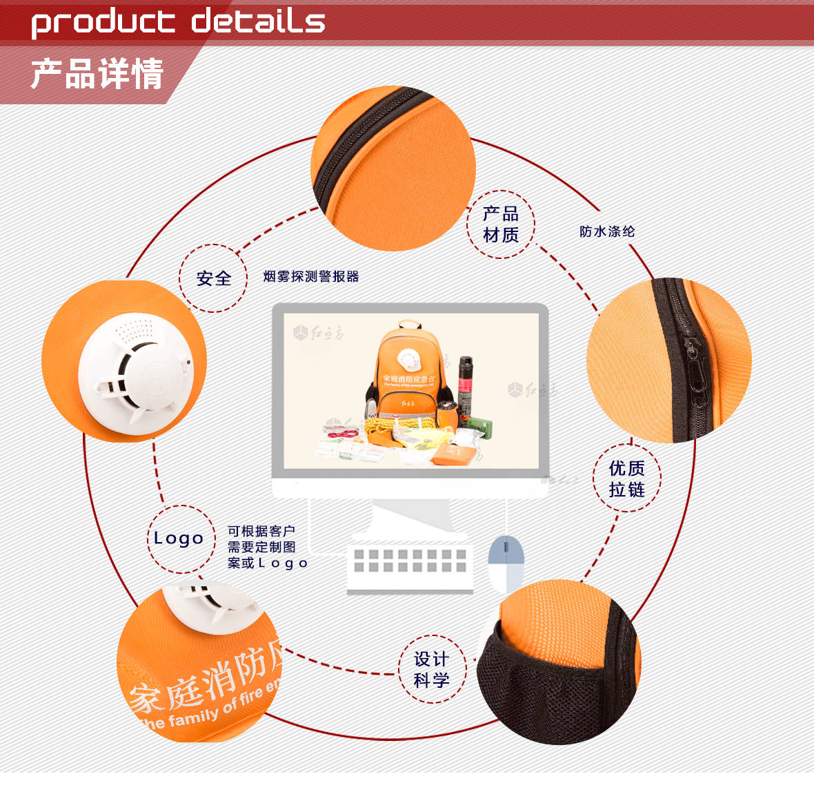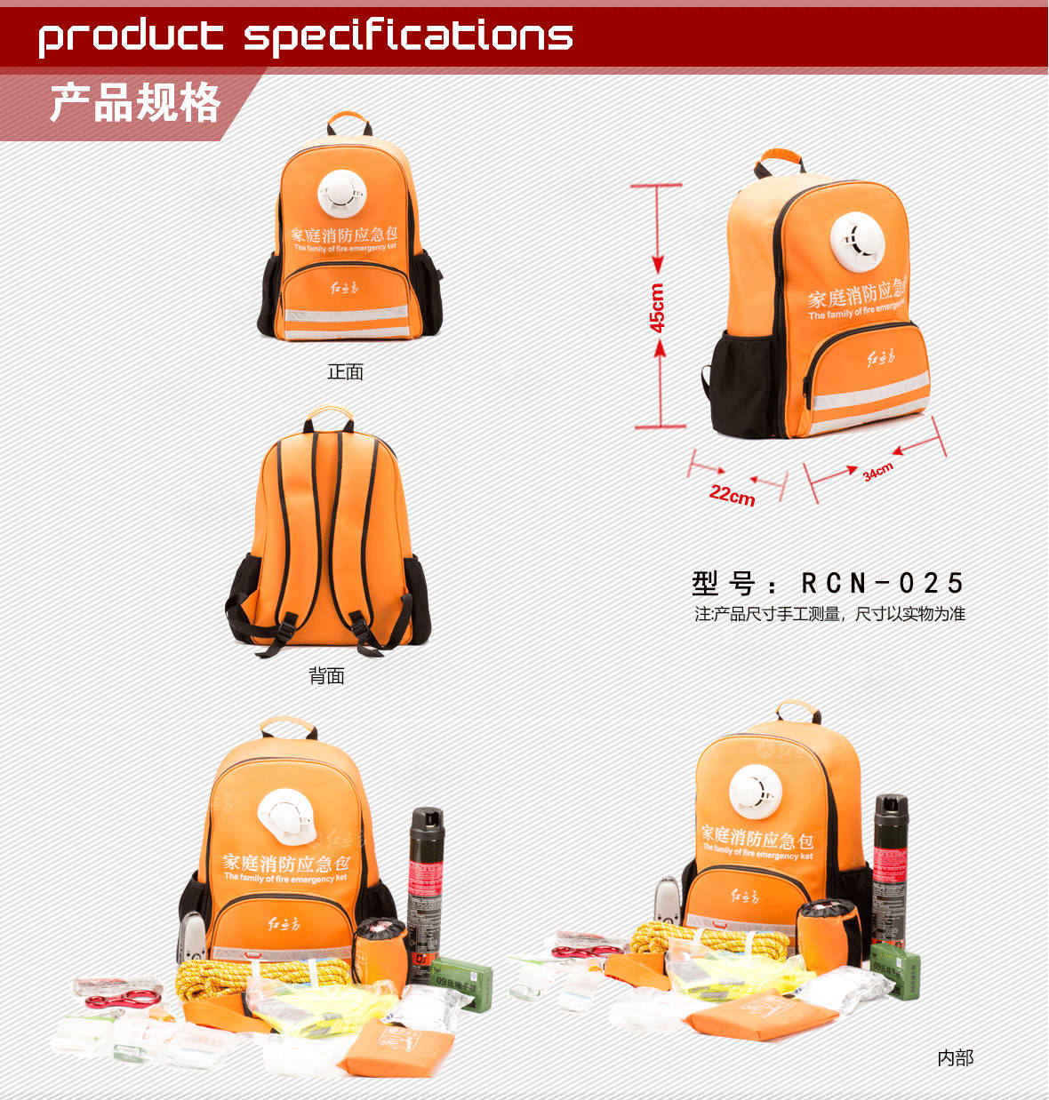 型號:RCN-025家庭應急包            外包材質:600D滌綸顏色:橘黃